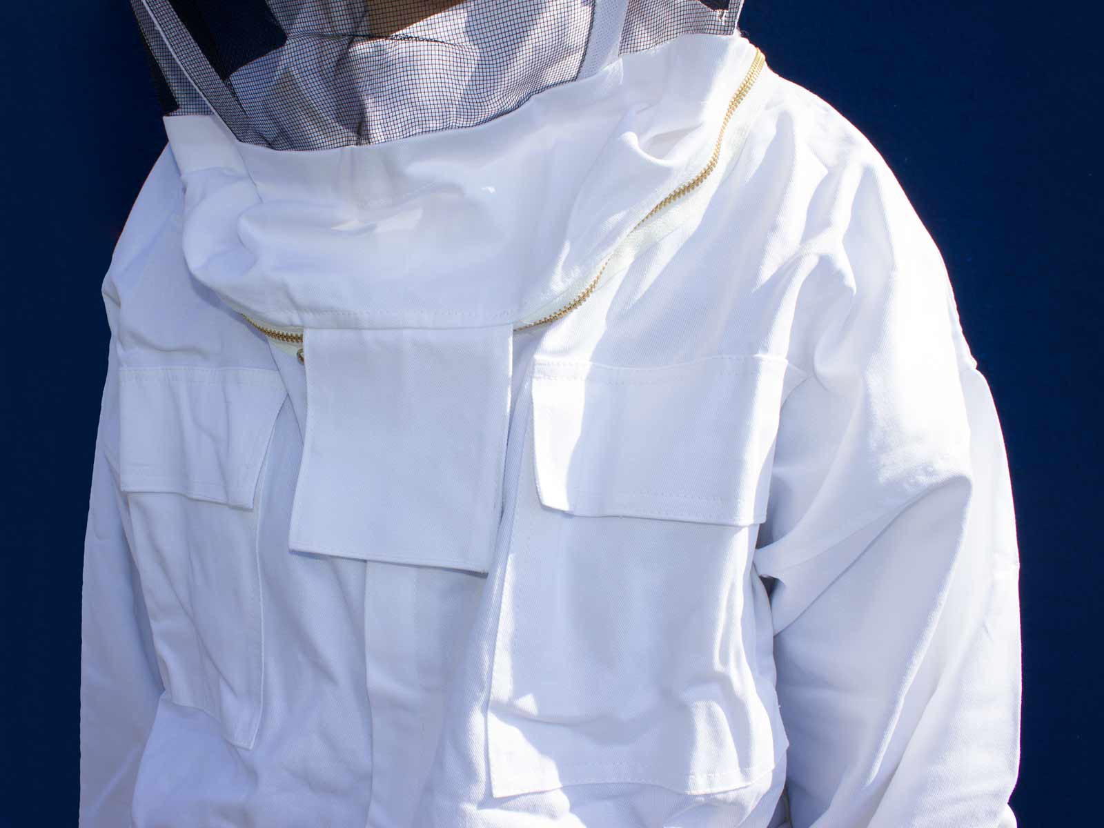Jacke für Imker und Imkerinnen aus Baumwoll-Kunstfaser Mischung. Dieser Stoff wird üblicherweise für belastbare Arbeitskleidung verarbeitet.